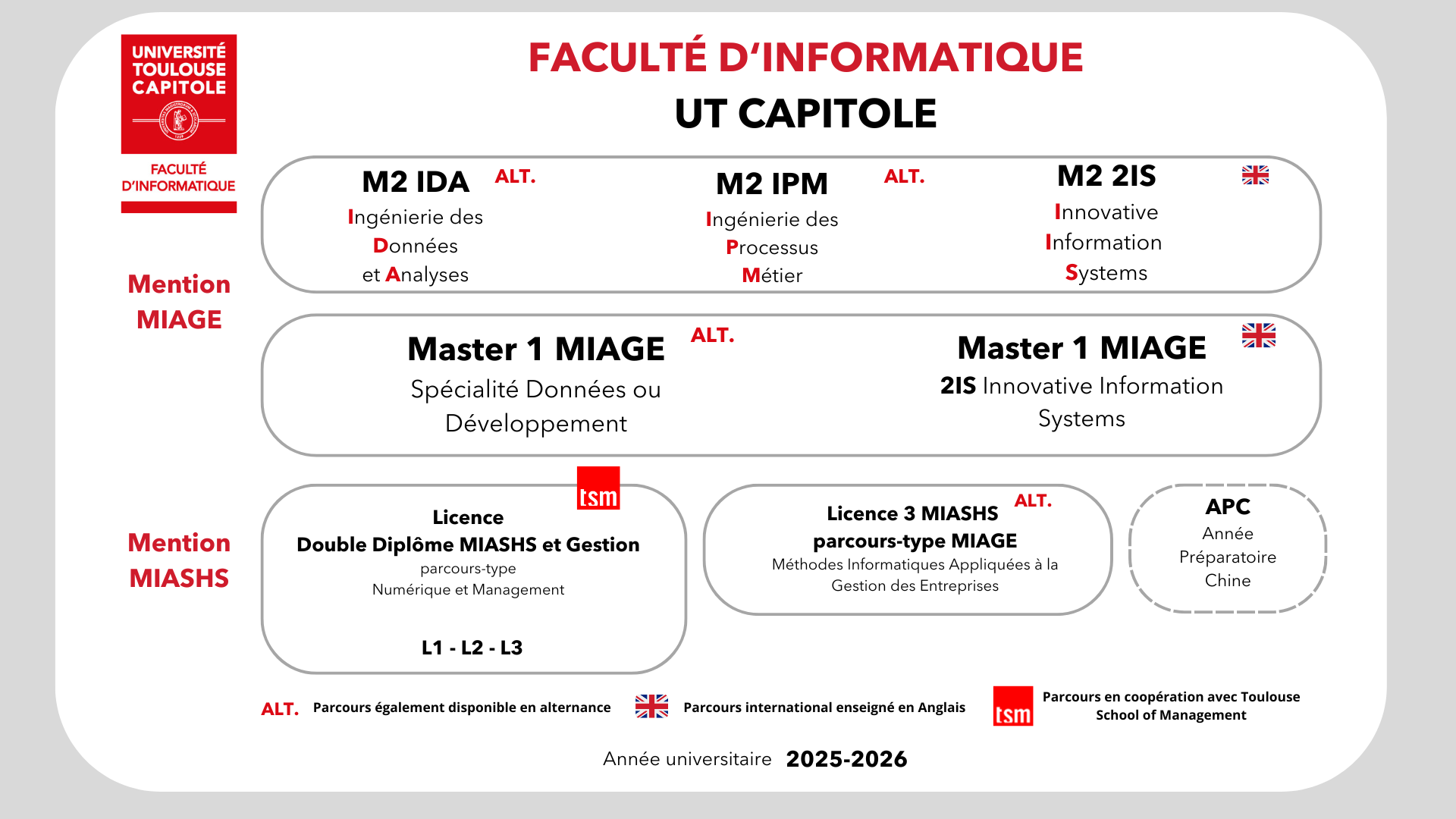 La Faculté d'Informatique à UT Capitole propose des parcours de Licence mention MIASHS, de Master mention MIAGE ainsi qu'une Année Préparatoire Chine