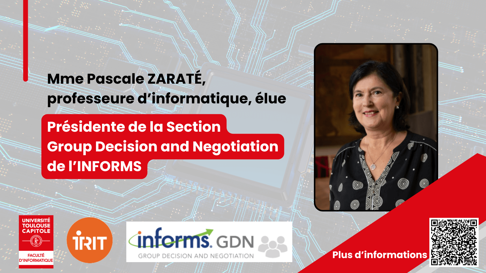 Après avoir été nommé Vice-Présidente 1 de Mars 2023 à Mars 2025, Pascale Zaraté, enseignante-chercheuse à UT Capitole et à l’Institut de Recherche en Informatique de Toulouse, est élue Présidente de la section Group Decision and Negotiation de l’INFORMS depuis Mars 2025.